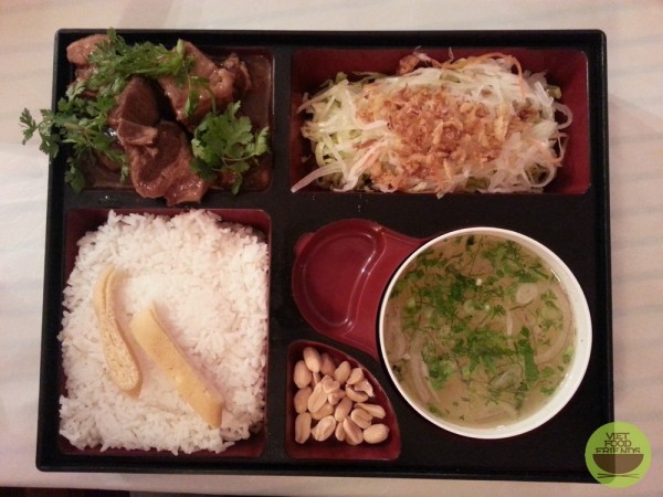 Bento menu obsahuje thịt kho tàu, které jsem při jedné z návštěv ochutnala také, vajíčkovou omeletu, lehký salát, vývar a arašídy. Opět se jednalo o předem upražené arašídy ze supermarketu, i když by se měly podávat ty čerstvě upražené. Ostatně to tak i měli na obrázku v menu.